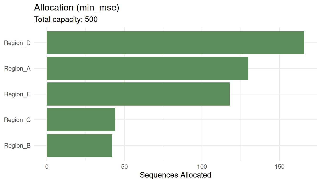 min_mse: Minimize the mean squared error of lineage prevalence estimates. This is a Neyman-type allocation that gives more sequences to high-variance strata.max_detection: Maximize the probability of detecting a rare variant. This spreads sequences to maximize geographic coverage.min_imbalance: Minimize the deviation from population-proportional representation. This ensures each region is fairly represented.
